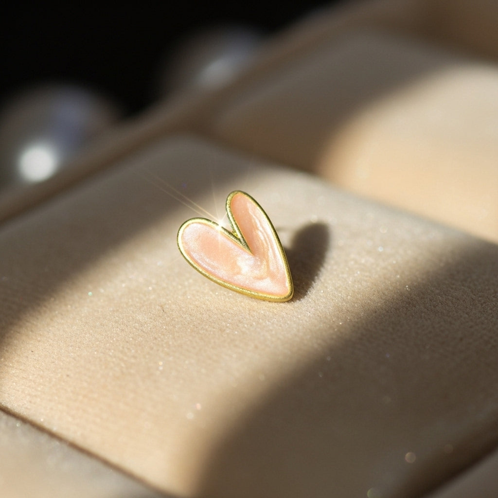 Adorable heart-shaped stud earrings featuring soft blush pink enamel with a lustrous pearlescent finish outlined in polished gold tone. The sweet asymmetric heart design creates a charming, romantic look with its gentle curves and glossy surface. These delicate studs combine innocent sweetness with elegant sophistication, perfect for adding a touch of love and feminine charm to everyday wear or special occasions.