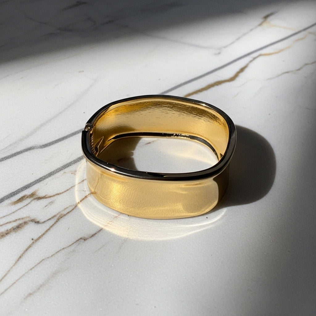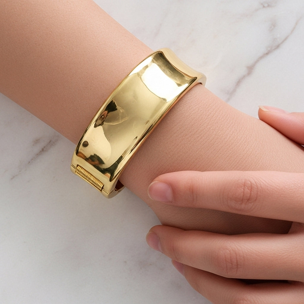 Striking wide gold-toned cuff bracelet featuring a bold, substantial design with a polished mirror finish. This statement piece showcases a modern, minimalist aesthetic with its wide band and secure hinged closure. The high-shine surface creates a luxurious look that commands attention, making it the perfect accessory for those who love to make a bold fashion statement.