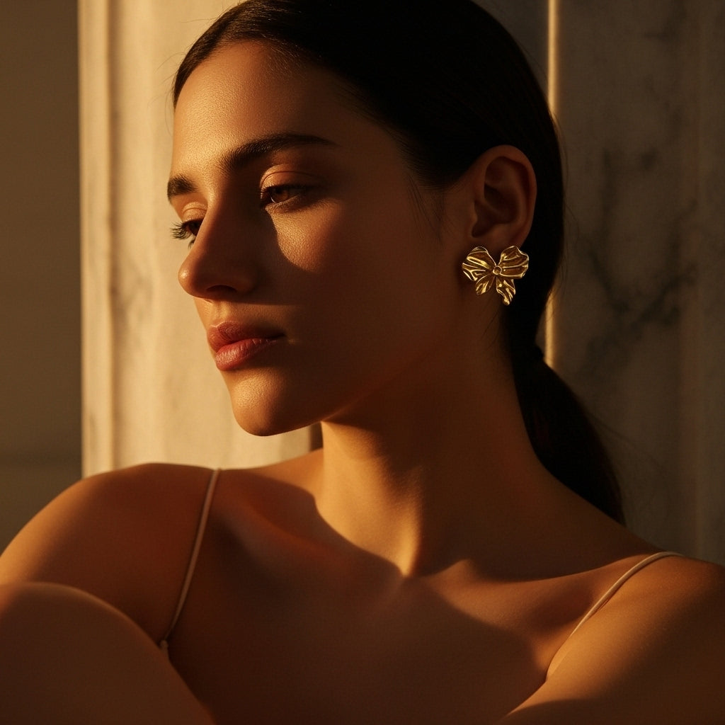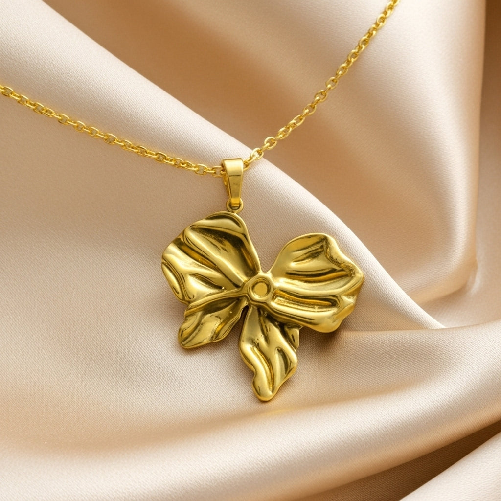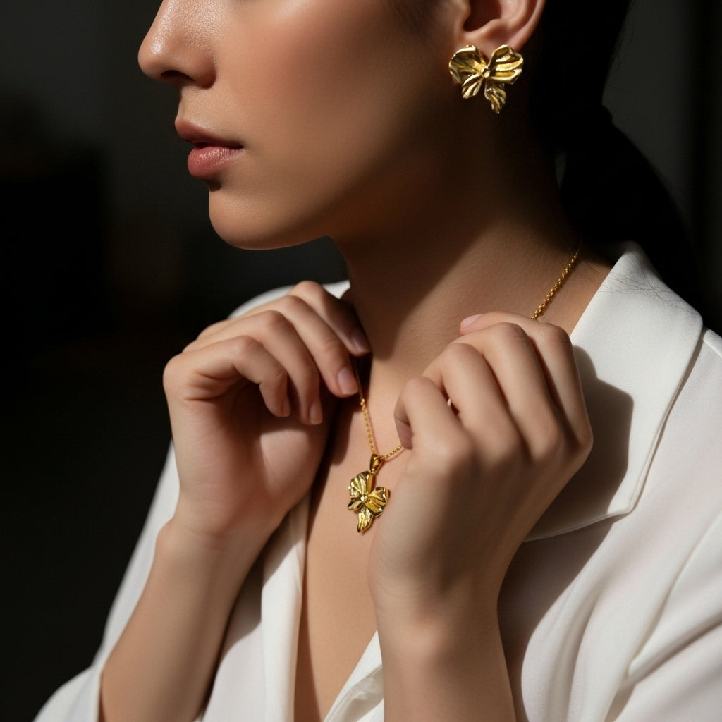Sophisticated jewelry set in polished gold tone featuring an elegant four-petal bow design with beautiful dimensional sculpting and flowing ribbon tails. The complete set includes a delicate chain necklace with a statement bow pendant, matching bow stud earrings, and a coordinating adjustable ring. Each piece showcases intricate textured detailing with graceful curves and a high-shine mirror finish that creates stunning light reflections. This refined coordinated set combines classic femininity with contemporary elegance, perfect for adding a touch of polished charm to any outfit.
