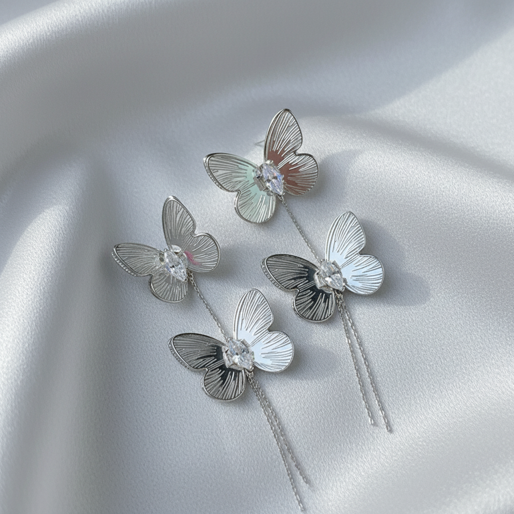 Enchanting double butterfly drop earrings in polished silver tone featuring delicate filigree wings with intricate line detailing and sparkling marquise-cut crystal centers. Two graduated butterflies are connected by an elegant chain threader, creating graceful movement and dimension. The ethereal design combines nature-inspired beauty with sophisticated sparkle, perfect for adding a touch of whimsy and elegance to any look.
