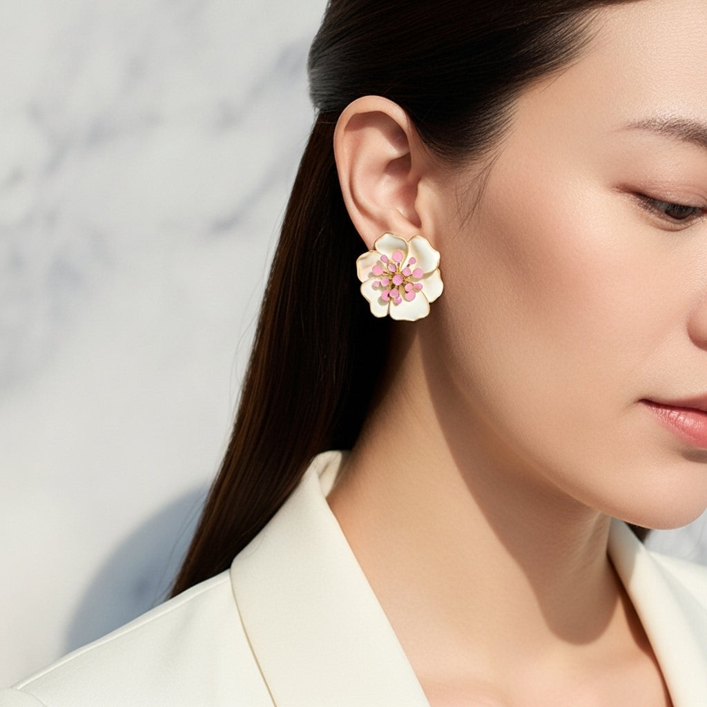 Charming white enamel flower earrings featuring delicate five-petal daisy design with soft pink stamen details in gold-toned setting. The pristine white petals are outlined in polished gold, creating a fresh, feminine look that captures the essence of spring blooms. These sweet stud earrings combine innocent charm with elegant sophistication, perfect for adding a touch of floral beauty to any outfit.