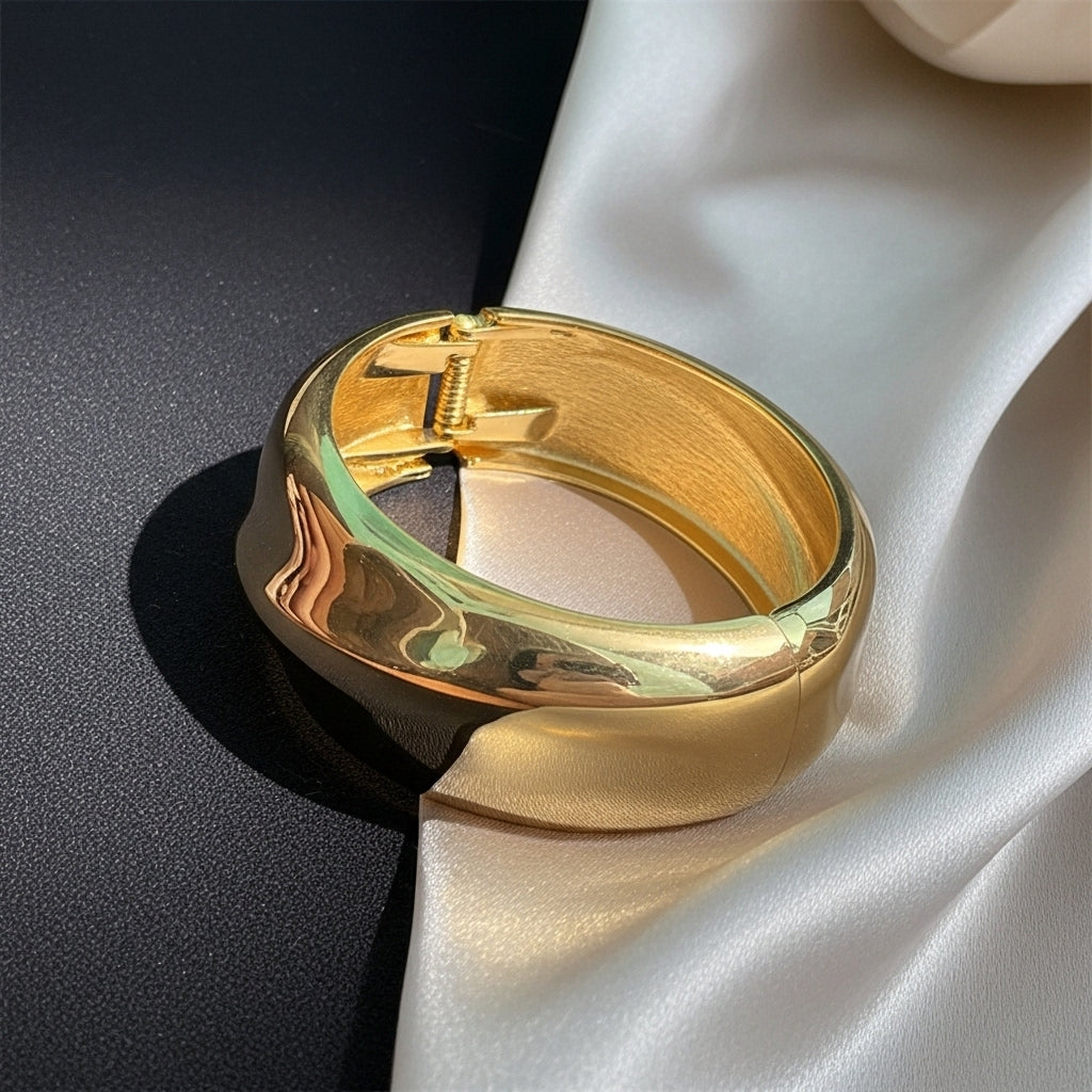 Luxurious wide gold-toned hinged bangle featuring a smooth, rounded dome design with a high-polish mirror finish. This statement piece showcases a bold, contemporary silhouette with its substantial width and elegant curved profile. The secure hinged closure ensures comfortable wear while the gleaming surface creates a sophisticated, eye-catching look perfect for elevating any outfit with timeless elegance.
