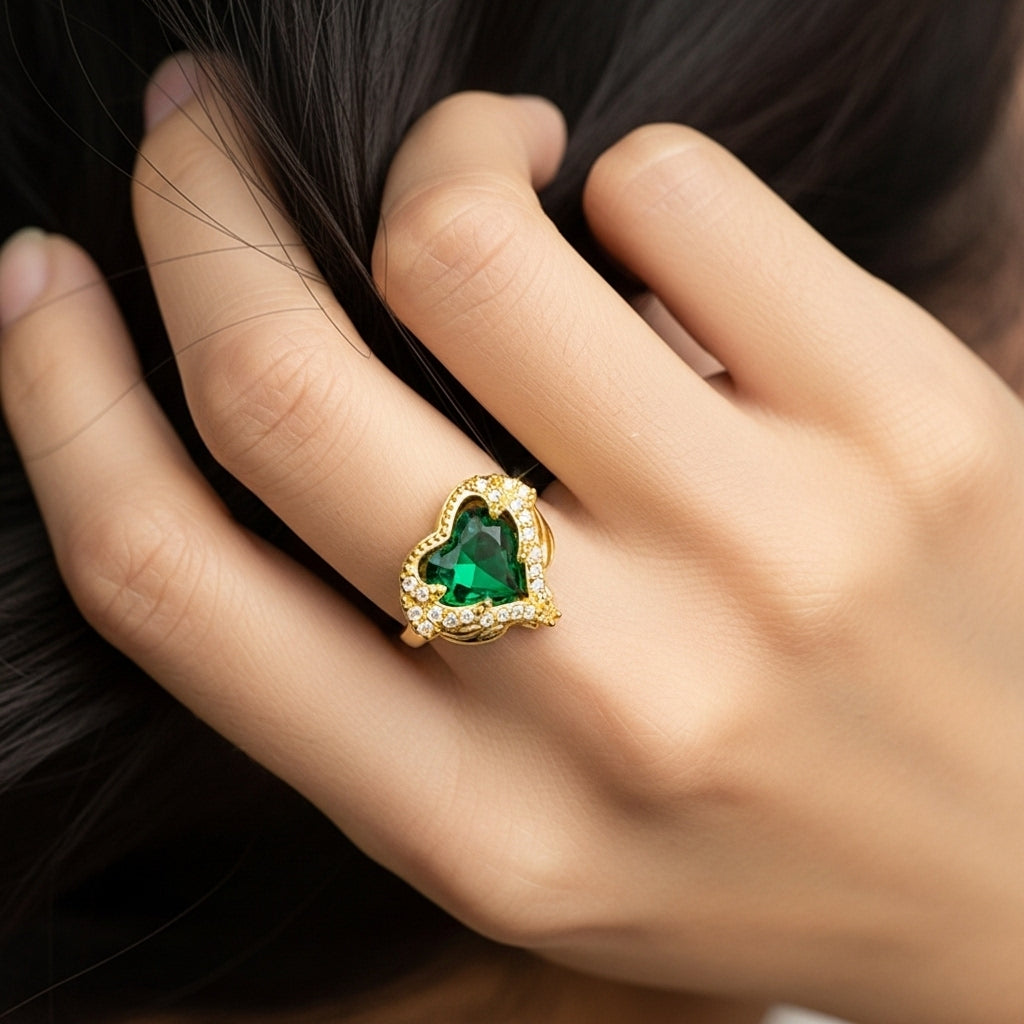 Luxurious jewelry set in polished gold tone featuring stunning emerald green heart-shaped crystals surrounded by sparkling clear crystal halos. The complete set includes a delicate chain necklace with heart pendant, matching drop earrings with hook closures, and an elegant adjustable ring. Each piece showcases rich emerald green stones with brilliant faceting that creates mesmerizing light play, framed by dazzling clear crystals in ornate gold settings. This romantic coordinated set combines timeless elegance with vibrant color, perfect for special occasions or adding a touch of luxury to any look.