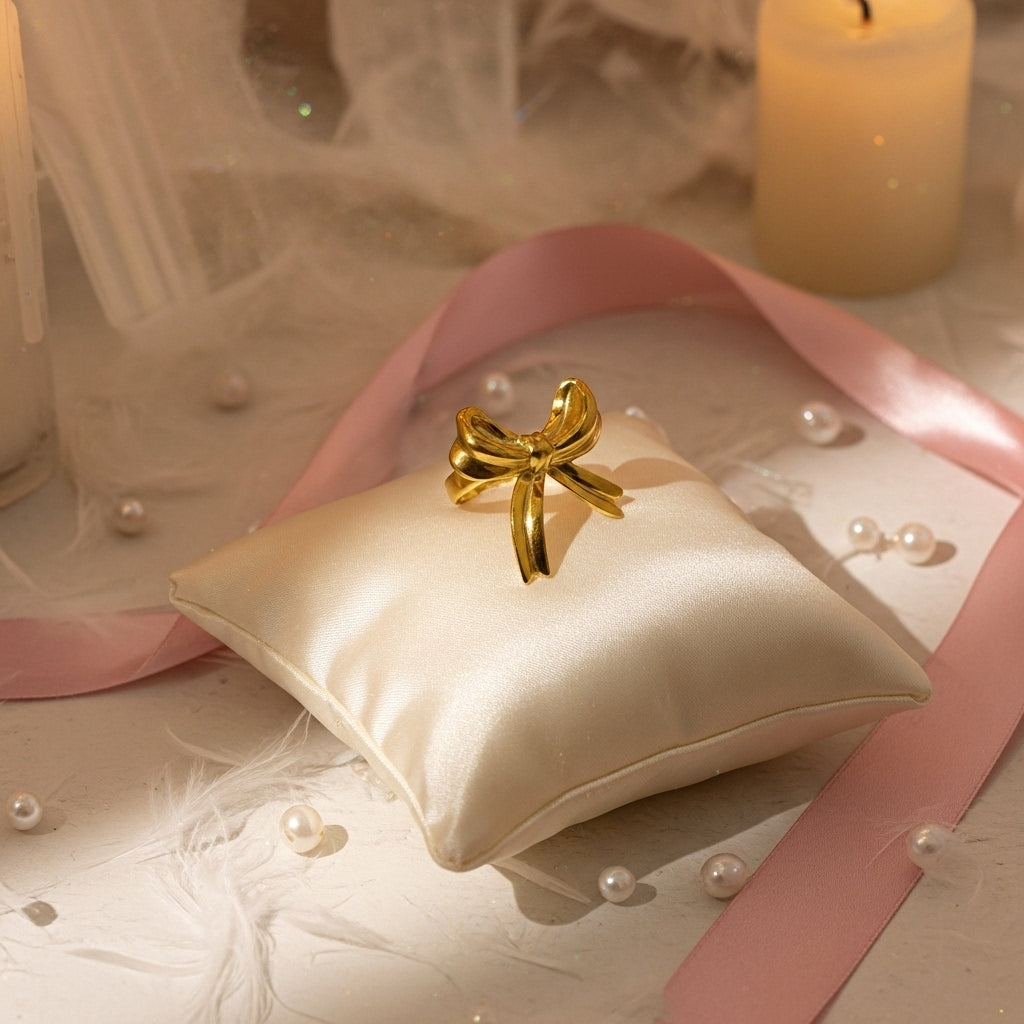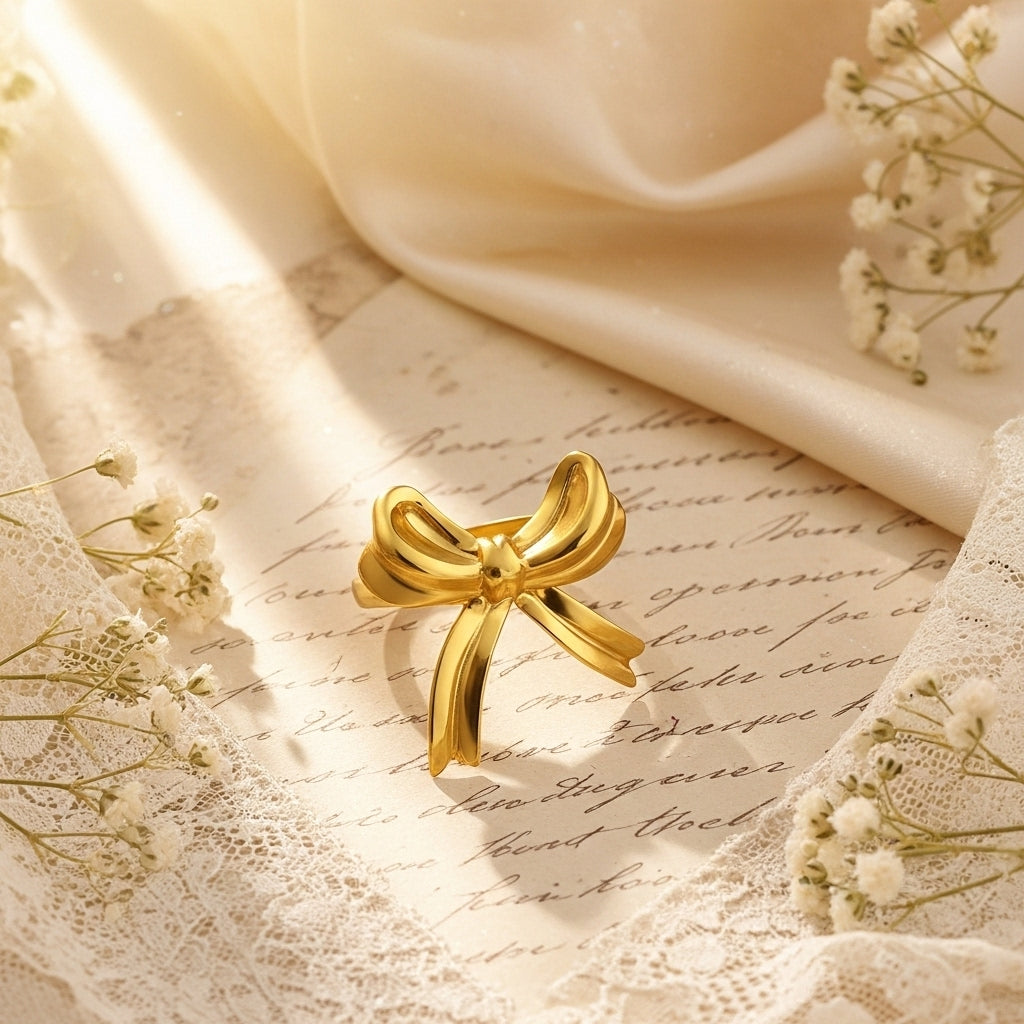 Sophisticated ring in polished gold tone featuring an exquisitely detailed three-dimensional bow design. The sculptural bow showcases beautifully crafted loops and flowing tails that capture the graceful movement and elegance of a classic ribbon. Each element is carefully formed with smooth, polished surfaces that create a luxurious high-shine mirror finish, reflecting light brilliantly from every angle. The dimensional design rises prominently from the band, making it a true statement piece that commands attention. The adjustable open-back band ensures a comfortable fit for most finger sizes. This charming yet sophisticated piece combines vintage-inspired elegance with playful femininity, perfect for adding a sweet romantic touch to any outfit. Ideal as a meaningful gift symbolizing connection, celebration, and the art of giving, for special occasions, or for those who appreciate jewelry with personality and timeless grace. The bow motif represents beauty, elegance, and thoughtful presentation.