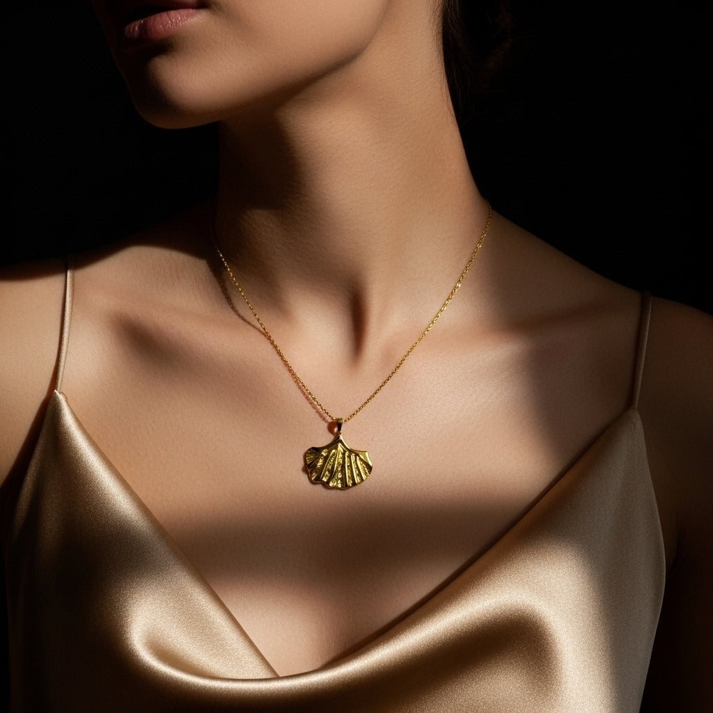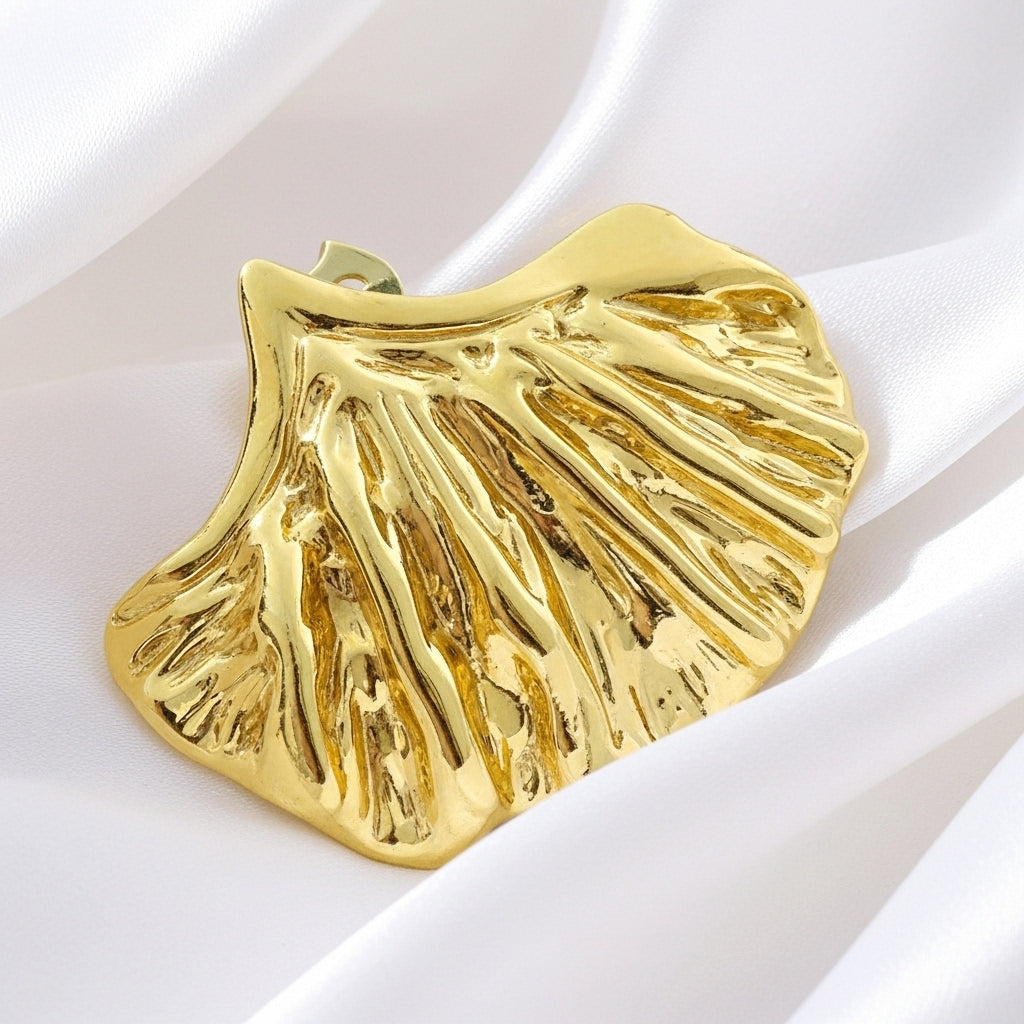 Exquisite ocean-inspired jewelry set in polished gold tone featuring beautifully sculpted seashell designs with intricate textured ridges and fan-like patterns. The complete set includes a delicate chain necklace with a dimensional shell pendant and matching shell stud earrings. Each piece showcases stunning organic detailing with radiating grooves that mimic natural scallop shells, creating a luxurious coastal elegance. This nature-inspired coordinated set combines beachy charm with sophisticated craftsmanship, perfect for adding a touch of seaside beauty and timeless style to any look.