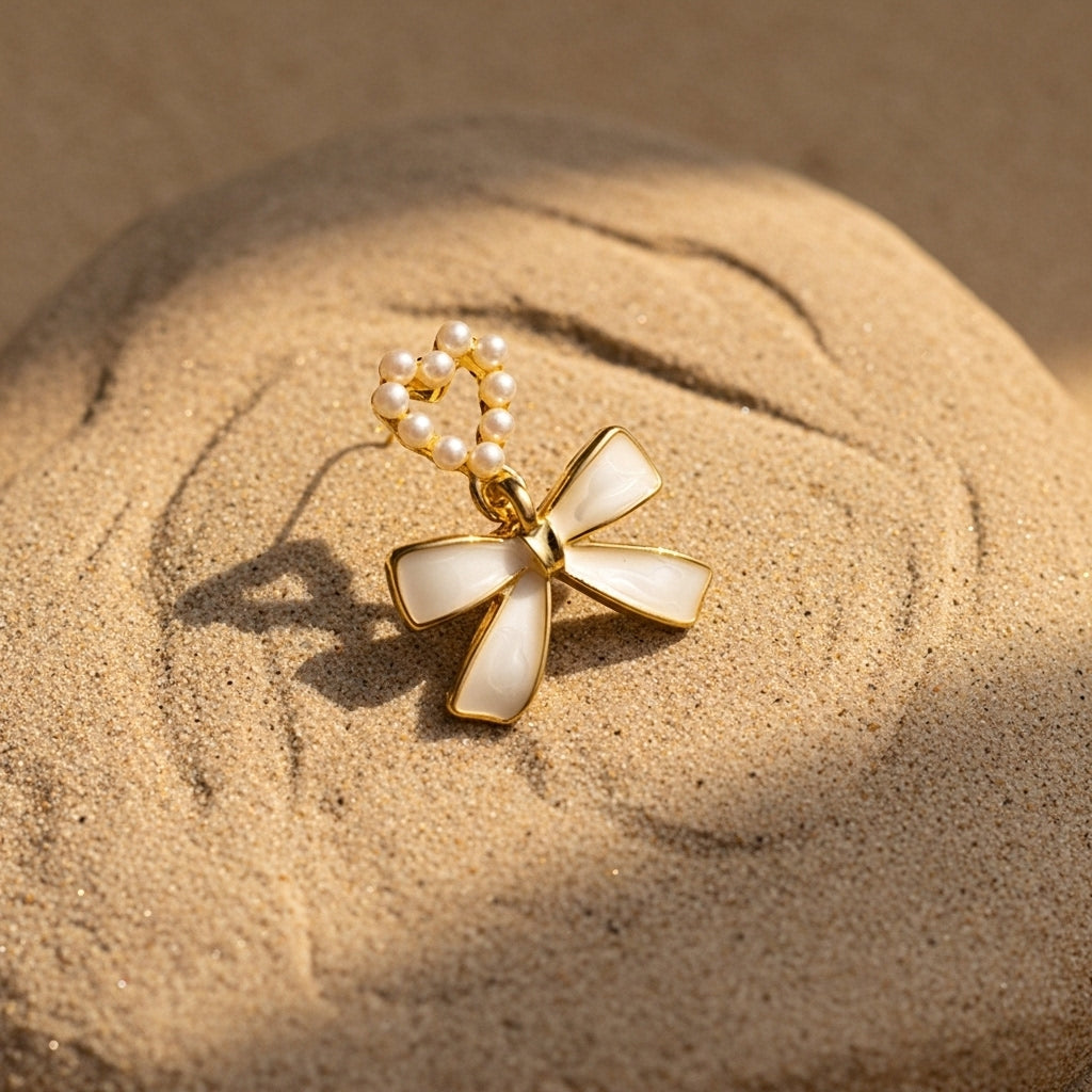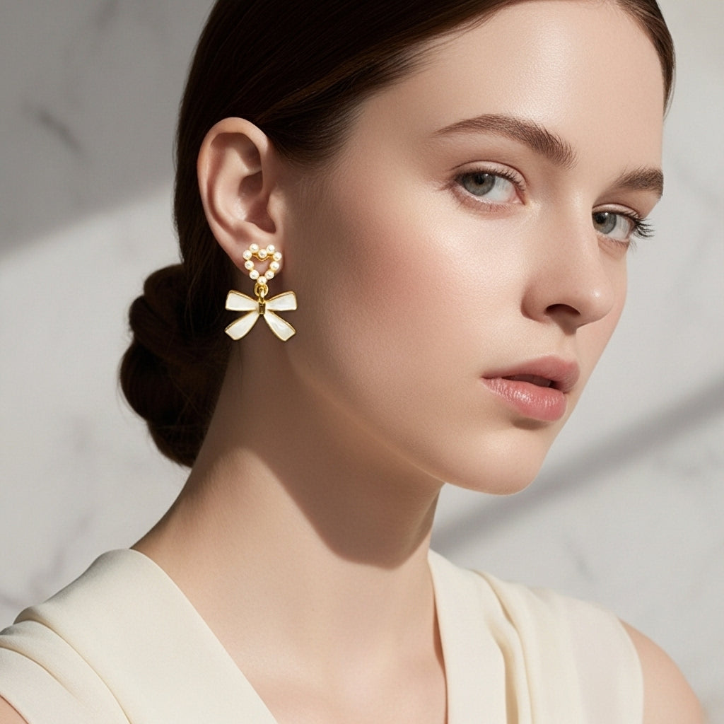 Charming drop earrings featuring a delicate pearl-studded heart at the top connected to an elegant white enamel bow. The heart is outlined with lustrous white pearls set in polished gold-toned frame, while the bow below showcases smooth white enamel with gold trim. This sweet and feminine design combines romantic symbolism with classic elegance, perfect for adding a touch of grace and charm to any look.