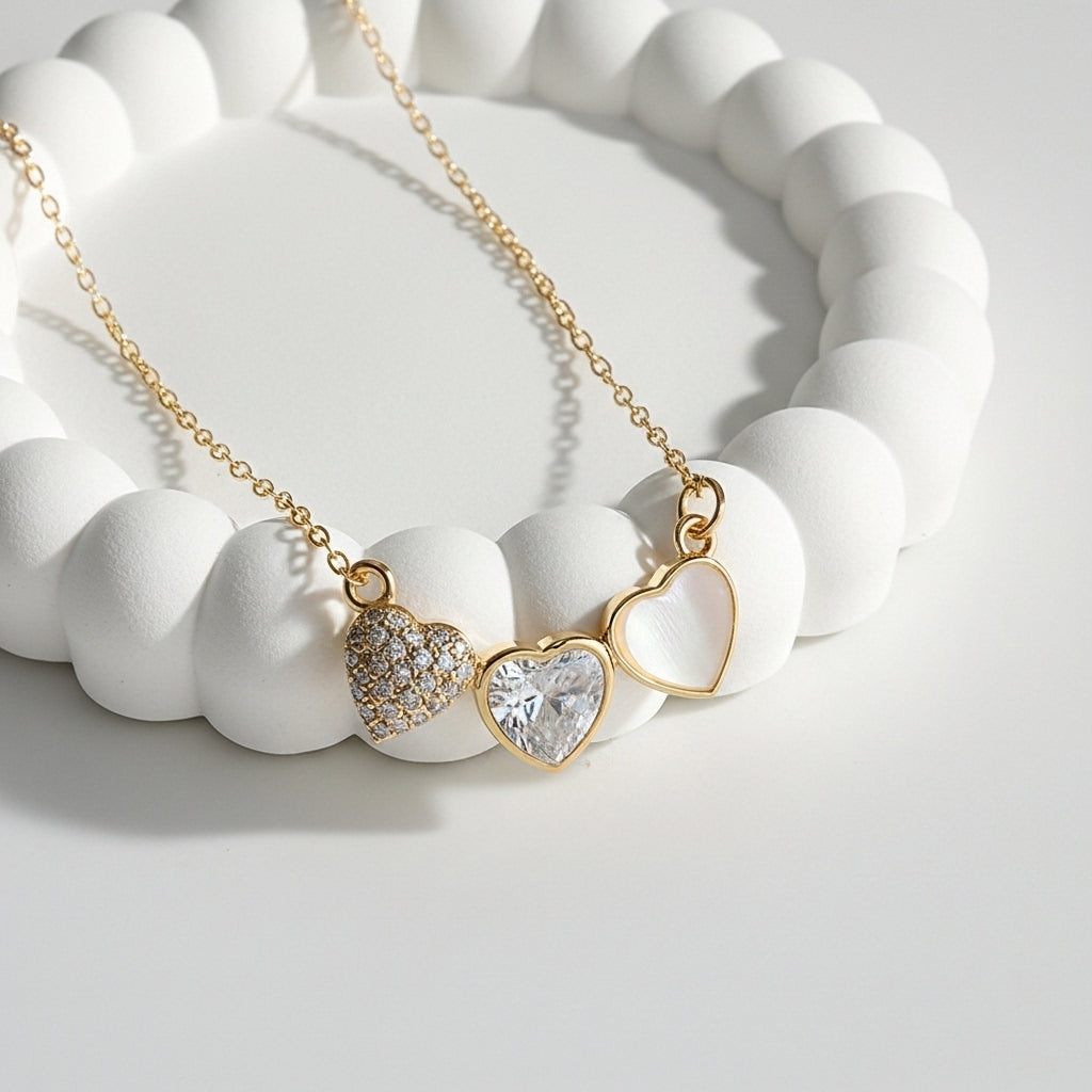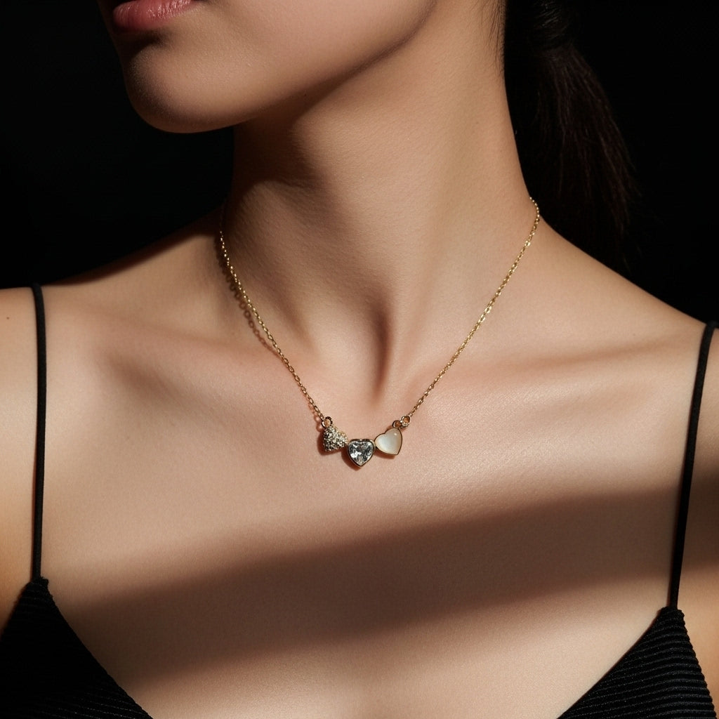 Charming necklace in polished gold tone featuring three adorable heart-shaped pendants in a row. The trio showcases a crystal-pavé heart sparkling with tiny clear stones, a faceted clear crystal heart with brilliant clarity, and a lustrous mother-of-pearl heart with iridescent shimmer. Each heart is beautifully framed in smooth gold bezels and connected by delicate jump rings. The variety of textures and finishes creates a delightful visual interest while maintaining a cohesive romantic theme. Suspended from a dainty cable chain, this sweet piece symbolizes love, friendship, and connection. Perfect for romantics, as a meaningful gift, or adding a touch of feminine charm to any outfit.