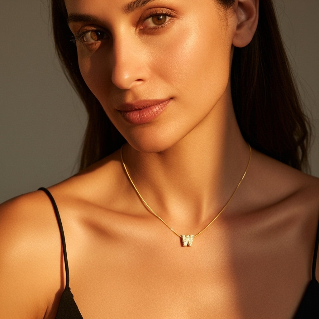 Stunning necklace in polished gold tone featuring a sparkling crystal-encrusted letter 'W' pendant. The dimensional double-V shaped letter is completely covered in brilliant pavé-set clear crystals that catch and reflect light from every angle, creating dazzling sparkle. Each tiny crystal is precisely set to maximize brilliance and create a luxurious, high-end look. The bold, chunky letter design makes a confident statement while maintaining elegant sophistication. Suspended from a delicate snake chain in matching gold tone that complements the pendant beautifully. This personalized piece is perfect for celebrating your own initial, gifting to someone whose name begins with 'W', or representing a loved one. Ideal for birthdays, anniversaries, graduations, or as a meaningful everyday accessory. The alphabet necklace trend combines personal expression with glamorous style, making it a versatile addition to any jewelry collection.