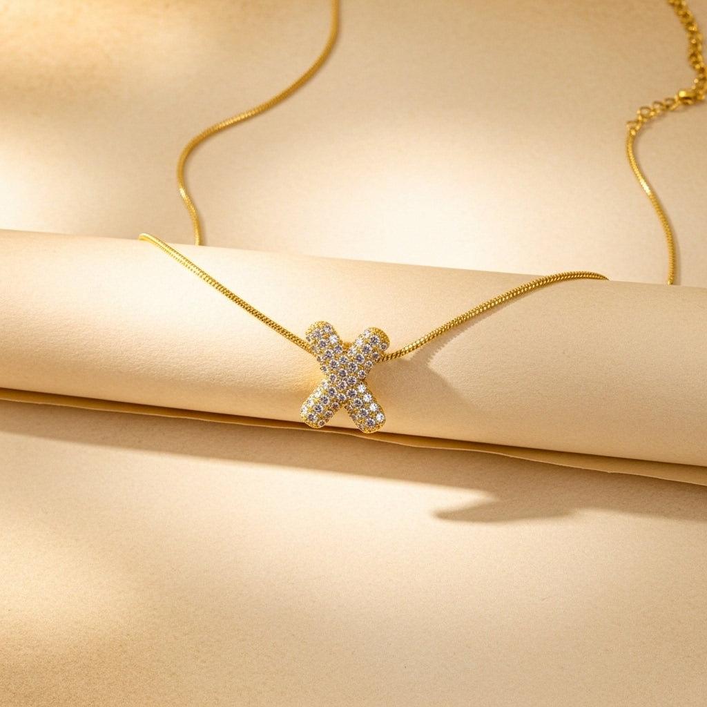 Stunning necklace in polished gold tone featuring a sparkling crystal-encrusted letter 'X' pendant. The dimensional cross-shaped letter is completely covered in brilliant pavé-set clear crystals that catch and reflect light from every angle, creating dazzling sparkle. Each tiny crystal is precisely set to maximize brilliance and create a luxurious, high-end look. The bold, chunky letter design makes a confident statement while maintaining elegant sophistication. Suspended from a delicate snake chain in matching gold tone that complements the pendant beautifully. This personalized piece is perfect for celebrating your own initial, gifting to someone whose name begins with 'X', or representing a loved one. Ideal for birthdays, anniversaries, graduations, or as a meaningful everyday accessory. The alphabet necklace trend combines personal expression with glamorous style, making it a versatile addition to any jewelry collection.